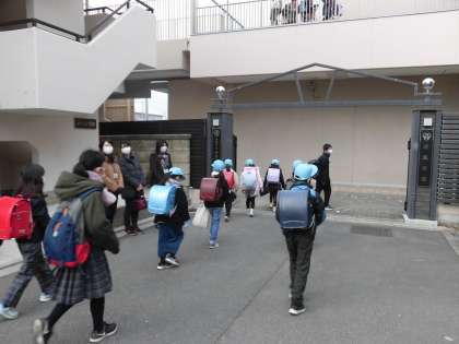 今日は朝から冷え込みが厳しい登校時間となりましたが,毎月初め恒例のPTA学年委員,本部役員,見守り委員のみなさんによる「朝のあいさつ・付き添い運動」を行いました。