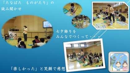 山本先生の「たなばたものがたり」の語りからスタート。図書の読み聞かせとはまた違い,反応を見ながらの語りに,子どもたちも物語の世界に入り込んでいました。
