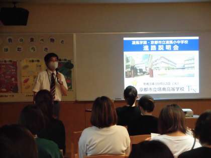 今回は京都の公立高校から塔南高等学校,私立高校から京都先端科学大学附属高等学校の先生方を講師としてお招きし,公立高校と私立高校の入試制度や高校の特色についてお話をいただきました。その後,今後の日程等の説明がありました。