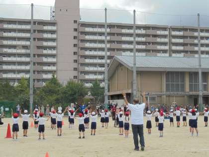 1年生の運動会です。準備運動で体をほぐして,50m走です。ゴールを目指して走りました。