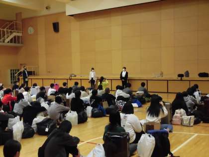 9年生は無事1泊2日の修学旅行を終え,元気に学園へ帰ってきました。帰校後,小体育館で解散式を行っています。