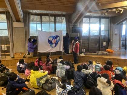 入所式を行い,その後そり遊びのレクチャーを受けています。
