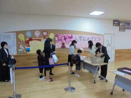 正門をくぐった先には,大きな看板があり,そこで記念撮影をする様子や自分のクラスを確認する様子もみられました。受付では,自分の名前を伝え,初めて出会う先生から胸花をつけてもらうことは,新しい環境へ飛びこむ第一歩でしたね。