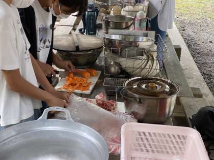 なかまと協力してカレーの食材を調理しています。