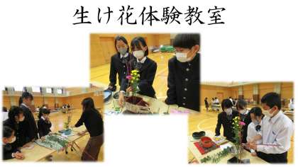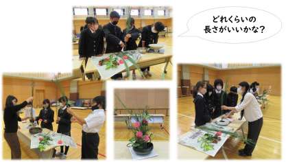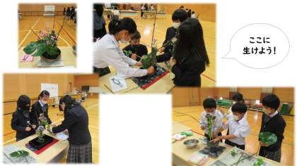 10月27日に生け花体験教室が行われました。自分たちで花の長さや生ける位置,バランスなどを話し合い,グループで1つの作品を作り上げました。どの作品もそれぞれの工夫があふれており,素敵でした。