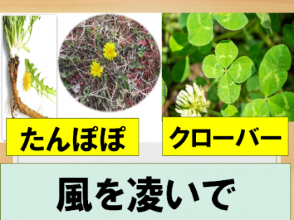 今日はもう一つ植物を紹介します。皆さんもよく知っている「クローバー」です。クローバーの葉は普通3枚ですが、時々葉っぱが4枚のクローバーが見つかります。発生率は一万分の一といわれ、なかなか見つけられないことから、見つけると幸せがおとずれるといわれています。そんな四葉のクローバーですが、実は見つかりやすい場所があるそうです。