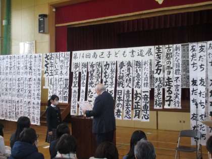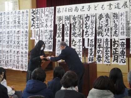 1月28日(土)、29日(日)に唐橋小学校体育館において第14回南区子ども書道展が行われました。南区の小、中学校から多くの作品が出品され展示されました。29日(日)の午前10時から入賞者の表彰式が行われ、凌風学園からも入賞者の代表者が参加し、賞状をいただきました。