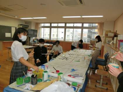9年生の修学旅行旗の制作が着々と進んでいます。素敵な原画はF・Yさん作です。少女が祈りを捧げ、その手から赤い糸が長くたなびくように伸び、折鶴や翼、4つ葉のクローバーが散りばめられているデザインは、平和な世の中や希望に満ちた未来を象徴しています。そして真ん中に、私たちのスローガン「絆・命・学 〜91人で結ぶ思い出の糸 in kyushu〜」という文字が大きく記されています。