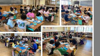 3年生の図画工作科では、「切ってかき出しくっつけて」の学習に取り組みました。かきべらや切り糸を工夫しながら使い、それぞれ思い思いの形に粘土を変化させていきました。道具を使うことで、手では表現できない新しい形をつくることができ、驚きと楽しそうな表情を浮べながら活動に取り組むことができました。