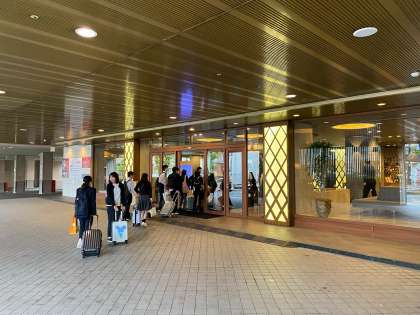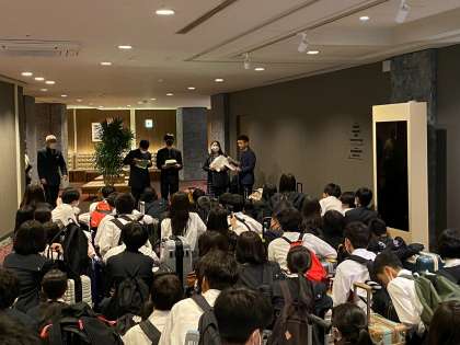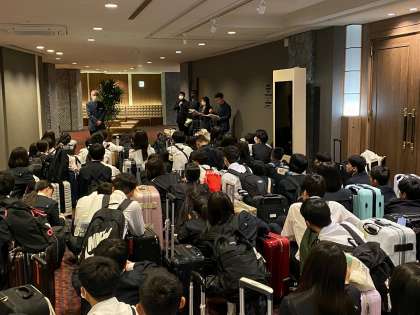 1日目のホテルに到着しました。入館式の様子です。この後、部屋に入った後、着替えてから夕食になります。今日の疲れをしっかりとってもらえればと思います。