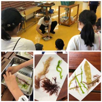 カッターと海藻押し葉の2グループに分かれて活動しています。こちらは海藻押し葉のグループです。緑や赤紫の海藻を選んで、押し花のやり方のように作ります。めかぶのにおいがする!海のにおいかな、と言いながら作業を進めています。型が決まったらあとは乾燥です。どのような仕上がりになるかな?