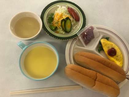 朝の食事です。コーンスープにオムレツ、サラダ。いつもの給食のパンと一味違うなぁと比べながら食べています。