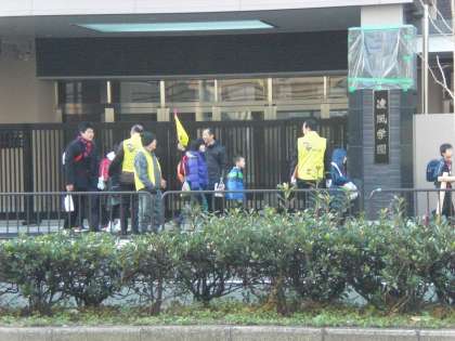 大きな声で、見守る地域の方々や教職員とあいさつを交わしながら、凌風学園までの経路を確認しました。