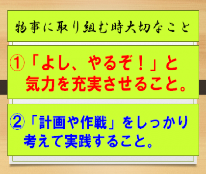これを機に、自分の目標を実現させるために、「よし、やるぞ」と気力を充実させ、「計画や具体的な行動」をしっかり考えて、実行してください。