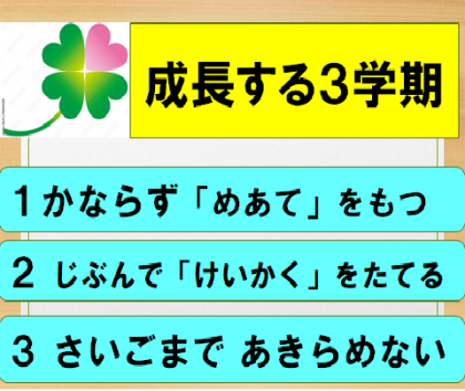 新たな年を迎え、学年やステージで皆さんが成長する3学期にすることを期待しています。そのためにも次の3つのことを常に心がけて生活してください。