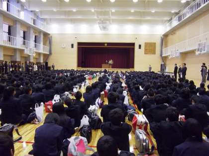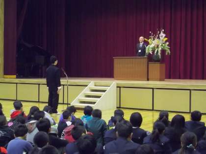 まずは,本学園に着任した教職員の着任式です。学園生の代表が歓迎の言葉を述べてくれました。今年度から始まる学園なので,教職員は全員が着任者です。そこで,80名を超える着任者を代表して,学園長が壇上でその言葉を受け止めました。