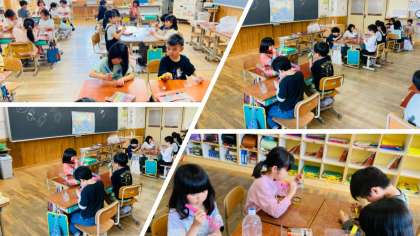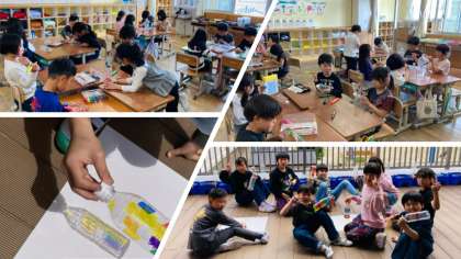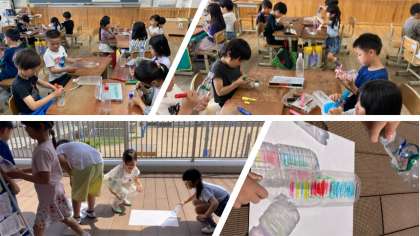 ペットボトルに水性ペンで色を塗り、光をとおして、いろいろな形や見え方を見つけたよ。