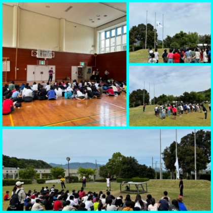 入所式です。3日間お世話になるマリーンピアの方に、ステージアップ宿泊学習のスローガン『全力で楽しみ、思いやりと学びの心をもとう』を伝えて、そのめあてに向けて過ごすことを誓いました。