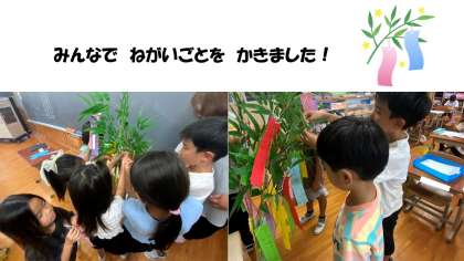短冊には、願い事を書いて、笹の葉に結びました。みんなのねがいごとが叶うといいですね!