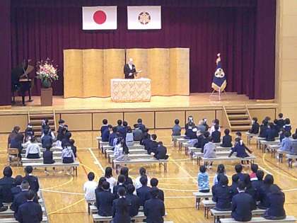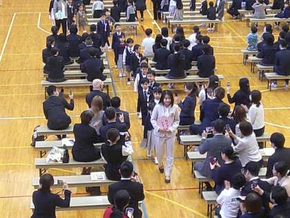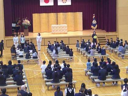 入学式では、音楽に合わせて入場し、学園長やPTA会長のお祝いの言葉をしっかりと聞いていました。