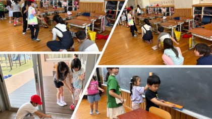 第一ステージのリーダーとして、4年生は今、一年生に掃除の仕方を教えています。分かりやすく伝えられるように丁寧に見本を示したり、お話をしたりする様子が見られました。