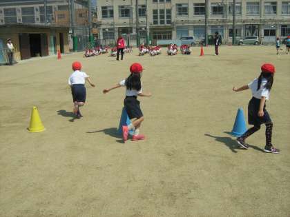 東和校地第2グラウンドにて1年生全員で「集まれゲーム」や「おにごっこ」,