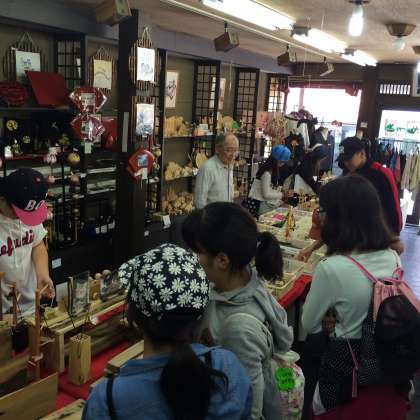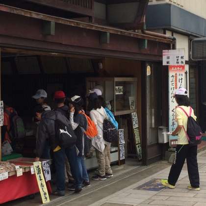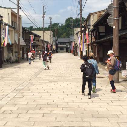 ここは,石畳小路の「七間(しちけん)通り」です。城下町の風情を感じながら,お土産選びにも余念がありません。また,銀行も風情があります。