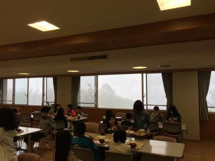 最終日を迎えました。今朝は,昨日まで降るのを我慢していたかのように感じる雨模様です。霧がかかっていて,それはそれで幻想的です。最後の朝のつどいを終え,掃除をし,最後の朝食をいただきました。