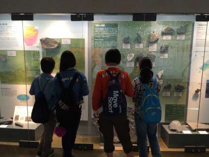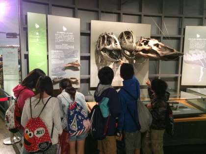 恐竜博物館につきました!動く恐竜や化石などがたくさんあり,グループで楽しそうにまわっています。