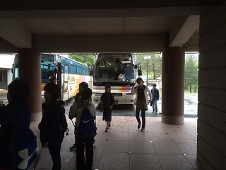 大野市オリエンテーリングを終えました。リーダーを中心に,全グループが時間通りに集合場所の「結ステーション」に戻ってくることができました。みんなで協力して名所も巡り,お土産も買い,大満足の様子です。大野市オリエンテーリングを終えて,バスに乗り込み,自然の家へ。自然の家のある山には雲がかかっています。