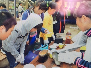 豚汁,炊き込み御飯の完成です!飯ごうを開けた瞬間は「おぉ〜」という歓声が湧き上がりました。味はとっても美味しく,完食しました。日もさし込み,暖かで楽しいランチタイムになりました。