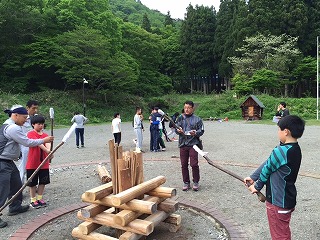 夜からのキャンプファイアーに向けて,レクリエーション係が練習と準備をしています。組んだ井桁には,最後の夜に忘れられないような思い出を作りたいという思いが込められています。