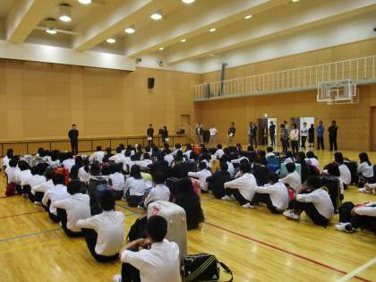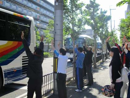 素晴らしい晴天に恵まれた修学旅行初日。午前7時30分、学校で結団式を終え,9年生はバスで信州に向かって元気に出発しました。3日間天候にも恵まれそうです。