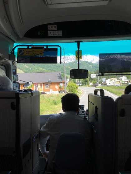 お世話になったペンションの方々とお別れし,一行は白馬ジャンプ競技場へ。バニラアイスのような山々と長野オリンピックで日本チームが金メダルに輝いたジャンプ台を背にして,思い出の記念撮影です。