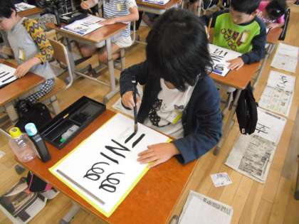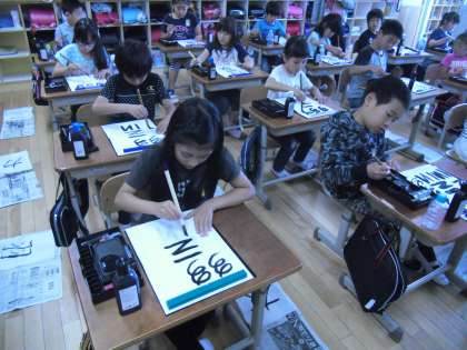 3年生になり,初めての習字の学習を行いました。準備や道具の使い方,後片付けまで初めてのことばかりでしたが,集中して取り組んでいました。字の太さや大きさに驚いているようでした。
