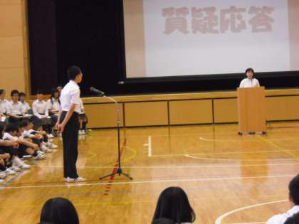 児童生徒会本部や代表専門委員会の基本方針,予算についての提案,各学級からの意見,要望,質問等では,代表が自分の考えを堂々と述べていました。これまでの学級討議や今日の学園総会では,「学園が今よりももっとよくなるように」という視点で学園生一人一人が考え,意見を出すことができたのではないでしょうか。