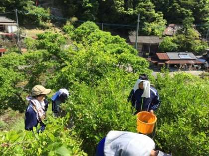 真っ青な空と海,まぶしい陽射しのもと,魚釣りとお茶の葉を摘んでいる様子です。