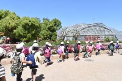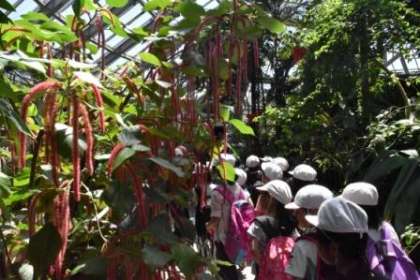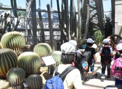温室見学では,「大きい葉っぱ!傘みたい!」「バナナがある!」「でっかいサボテンもある!」と,普段見られない熱帯植物に驚きながら見入っていました。