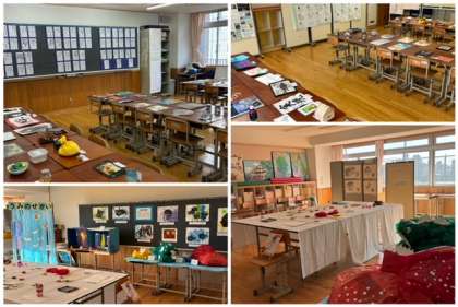 2学期末の個人懇談会の期間に文化祭展示の部を各学年やステージのフロアで開催しています。学園生が各教科の授業や「光と風学習」(生活・総合的な時間の学習)、部活動、コリアみんぞく教室などで取り組んだ作品を展示し、懇談会に来校された保護者の皆さまに見ていただいています。