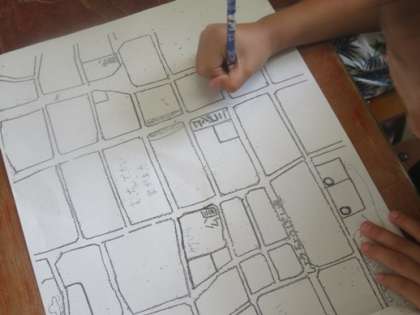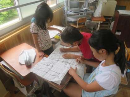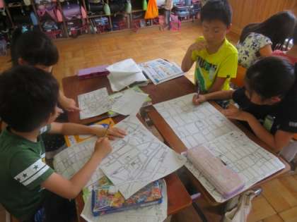 社会科の学習で校区たんに出かけ,調べてわかったことを絵地図にまとめました。「〜のお店はここだったかな」「ここは家が多かったね」など,子ども達は話し合いながらまとめていました。