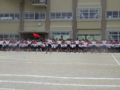 午後一番の種目は,応援合戦でした。お互いに一生懸命声を出していました。赤組,白組共に,自分たちのスローガンを目標に頑張っていました。