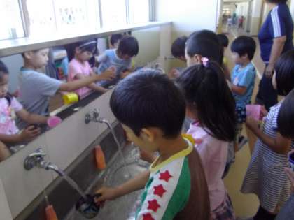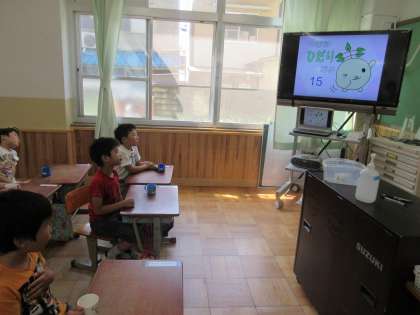 最初にうがいコップに薬を入れていきます。「いいにおい〜」と嬉しそうな子どもや,苦手そうに顔をしかめる子どもがいます。次に,テレビの画面で音楽が流れ,「右20秒,左20秒,前20秒」と順番に映し出される映像を見ながらうがいをします。最後にうがいコップを手洗い場で洗って終了です。