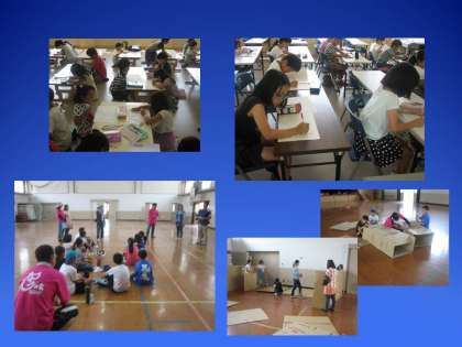 運動場や体育館では,おやじの会・保護者ボランティアの皆さんが,防災体験プレキャンプを実施してくださっています。秋に実施する防災体験キャンプに向け,6年生のリーダー性を育てようとしてくださっています。