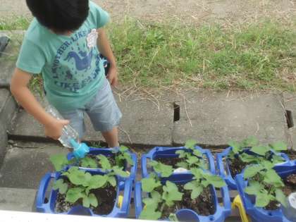 どんどん大きくなるあさがお。それを見にいくのを楽しみに,毎日たっぷり水をあげています。「この前よりはっぱが大きくなった」「はっぱの数が増えた」などなど,前日との違いもいっぱい見つけています。「はやく花がさかないかな」と,ますますお世話をがんばる子ども達です。