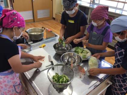 調理実習で「ゆで野菜のサラダ」と「ゆで卵」を作りました。初めての調理実習でしたが,一人ひとりが自分の役割に責任をもってとりくむことができました。また,手が空いたら友達を手伝ったり,洗い物をしたりと,手際よく調理することができました。