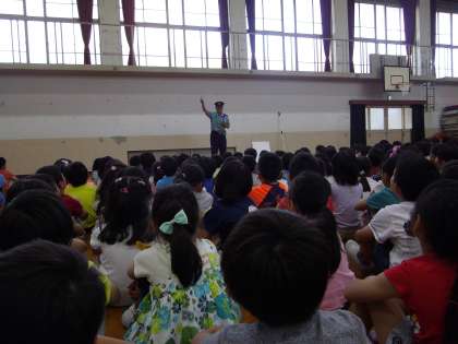 防犯の避難訓練がありました。もしもの時に備えて訓練しておくことは,とても大切なことです。1年生は,小学校での避難訓練にはまだ慣れていませんが,経路を確認しながら真剣な眼差しで行動することができました。体育館では,「いかのおすし」の合言葉を全校児童で確認しました。
