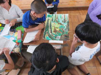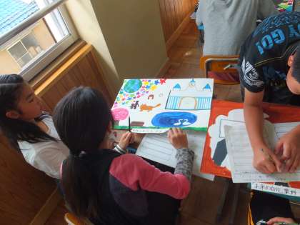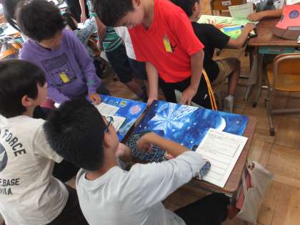 図画工作科の「想像のつばさをひろげて」の学習で描いた作品を鑑賞し合いました。自分の好きな風景や行ってみたい世界,想像した宇宙等,人によって様々な想像の世界がありました。お互いの作品を鑑賞し合う中で,
