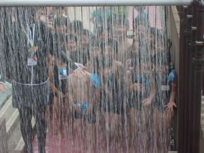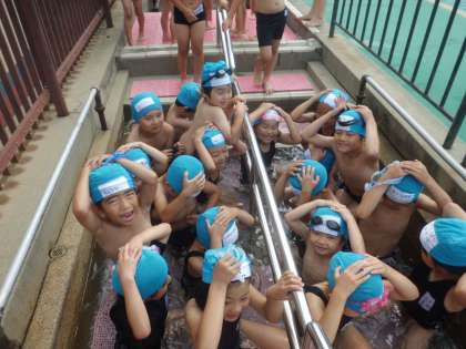 いよいよシャワーを浴びます。帽子を脱いで,シャワーで体や頭をしっかり洗います。水が冷たいので,思わず「きゃー」と声を上げる子もいました。