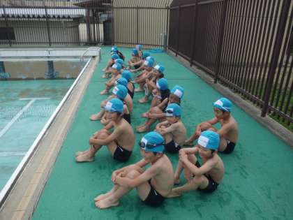そして,プールサイドでバディ(二人組)を作り,整列します。しっかり話を聞いて,安全に気をつけて行動できています。