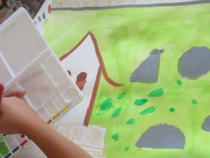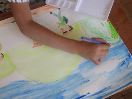 図工「うれしかったのあの気持ち」の学習で,うれしかったそのときの気持ちが表れるように,表し方を工夫しています。子ども達の絵が完成に近づいてきました。